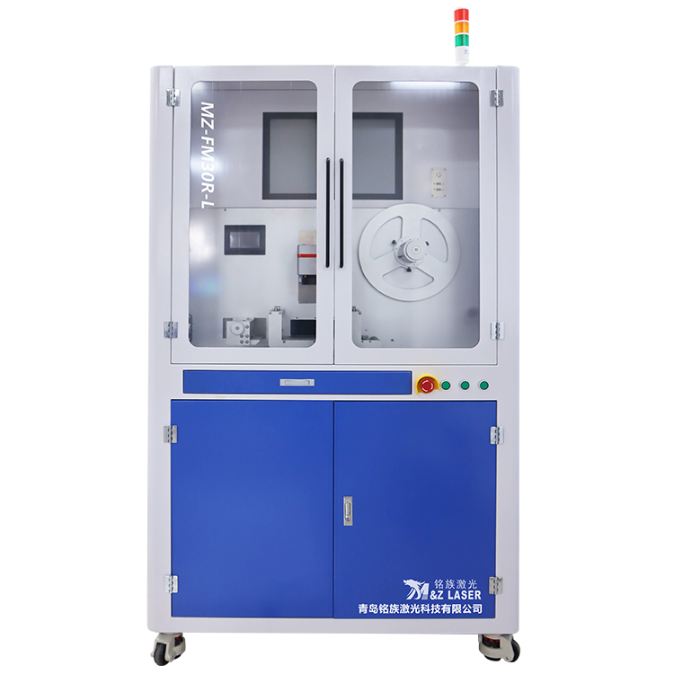 MZ-FM30-RL是一款全自動3M標簽激光打標機,其工作臺上安裝全自動放卷送料系統(tǒng),人工將一卷標簽紙安裝好后并將整卷標簽紙送入導向板后壓緊,人工啟動打標開關,標簽紙自動走到打標位置真空吸附平整觸發(fā)激光打標,標簽紙打標完成,標簽紙運動到切紙位置,切紙機構壓緊標簽紙,自動切紙后退回到原位,切紙機構松開標簽紙,標簽紙掉落到接料盒收納,打標機進行下一張標簽紙打標循環(huán),整卷紙根據(jù)人工或者MES系統(tǒng)給的